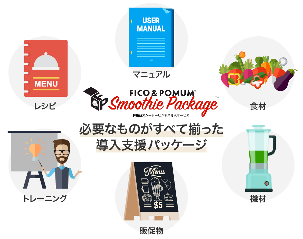 そして、スムージーをきっかけにさらに多くの人の健康意識を高めるため、「F&P」で蓄積したノウハウを外部事業者向けにパッケージ化した、併設型スムージービジネス導入サービス「Smoothie Package」を手掛けています。