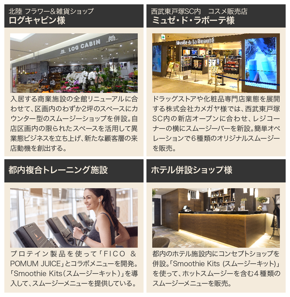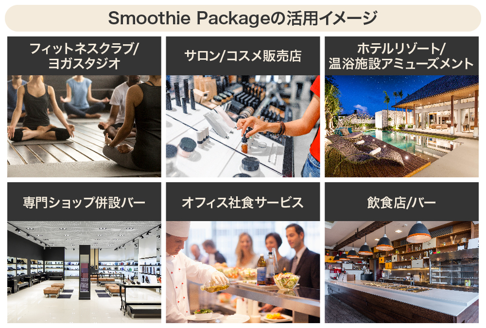 「Smoothie Package」は導入の「軽さ」を売りに、トレーニング施設様やフラワーショップのログキャビン様等、様々な業態への導入を進めています。なかでもスムージーが有する「おしゃれで健康的」なイメージと相性の良い業態からのニーズが高まっています。