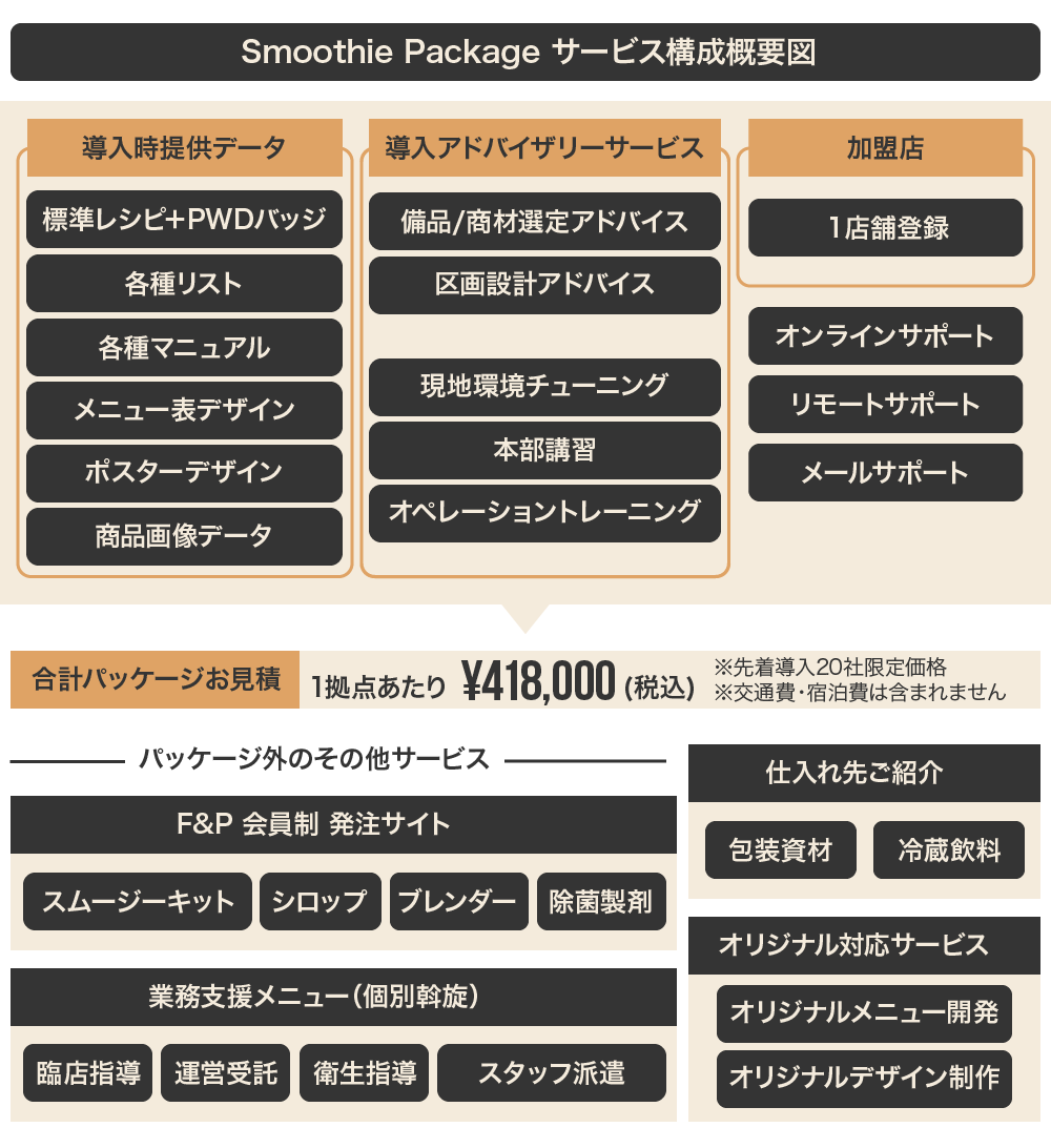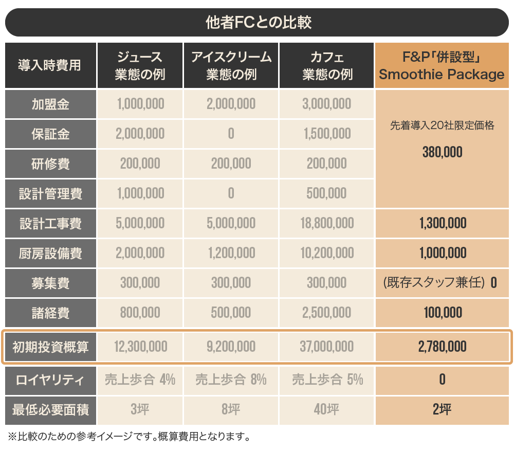 「Smoothie Package」は従来のFCモデルをアップデートしたモデルだと考えています。一般的なFCモデルでは加盟金等の初期投資にまとまった額が必要な上に、その後もロイヤリティが発生します。