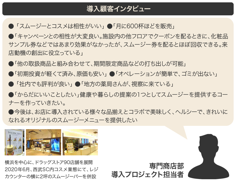 スムージーは、「美容」を外側と内側から補完し合う意味合いでコスメショップとの相性が良く、現在、株式会社カメガヤ様(以下同社)をパートナーに、東戸塚にある大型化粧品専門店「ミュゼ・ド・ラボーテ」様に導入させていただき、新たな来店動機の創出や客単価、イメージ向上に貢献できるようお手伝いしています。