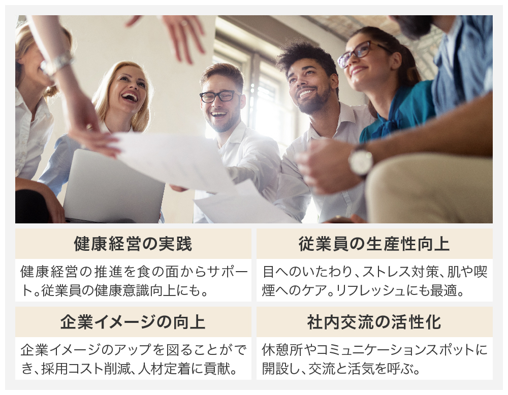 空きスペースの活用はもちろん、従業員の健康を食の面からサポートし、さらにスムージーバーが休憩所となって社内交流の機会を創出するなどメリットは多く、今後の導入拡大の起爆剤になると考えています。