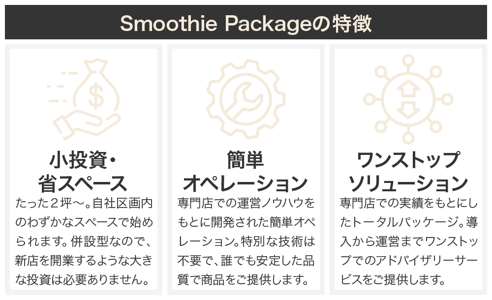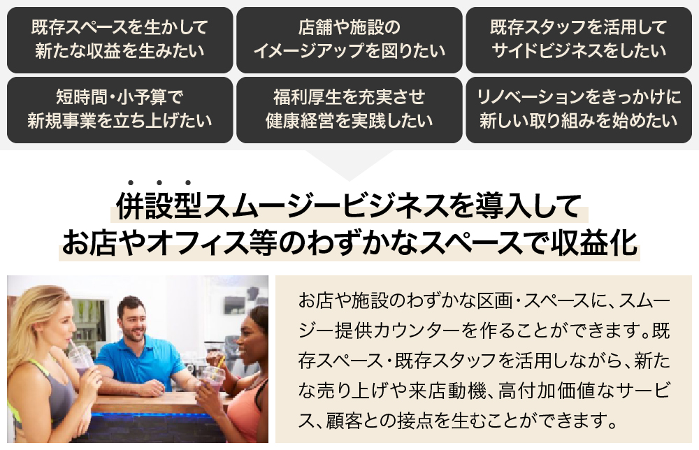 「Smoothie Package」は、たった2坪からの空きスペースにスムージーカウンターを併設し、導入先の新たな収益を生み出す「併設型スムージービジネス導入サービス」です。