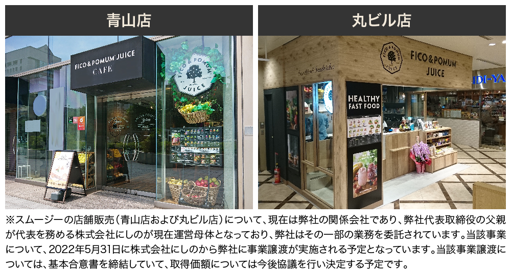 スムージーの店舗販売(青山店および丸ビル店)について、株式会社にしのが現在運営母体となっており、発行者はその一部の業務を委託されていますが、当該事業について、2022年5月31日に株式会社にしのから発行者に事業譲渡が実施される予定となっています。当該事業譲渡については、基本合意書を締結していて、取得価額については今後協議を行い決定する予定です。