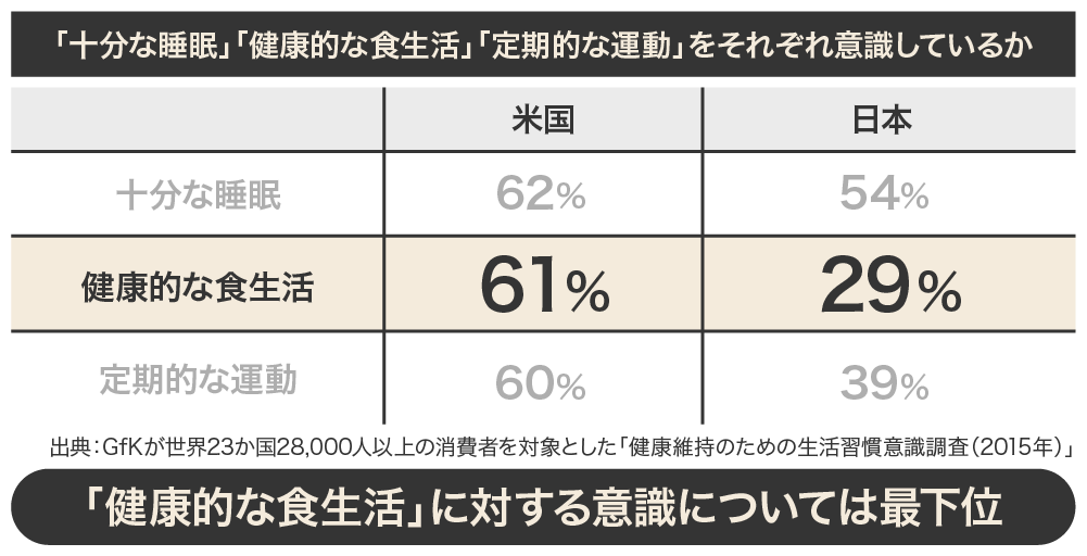 長寿大国と言われる日本ですが、意外に健康意識は低いことがわかっています。一方、肥満大国と思われているアメリカは、実は健康意識が高く、スーパーには種類豊富な野菜と果物が並び、国民一人一人が自身に合った食材を選ぶといった食文化が浸透しています。弊社独自の調査によるとスムージーショップの出店数も約4000店舗とスターバックスの3分の1に迫るほど拡大しており、健康意識の高さを裏付けています。
