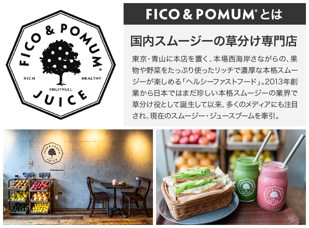 そうした中、弊社は日本の時代に合った食文化を創造すべく、2013年より国内スムージーの草分け的存在となる「FICO & POMUM(以下F&P)」を展開しています。