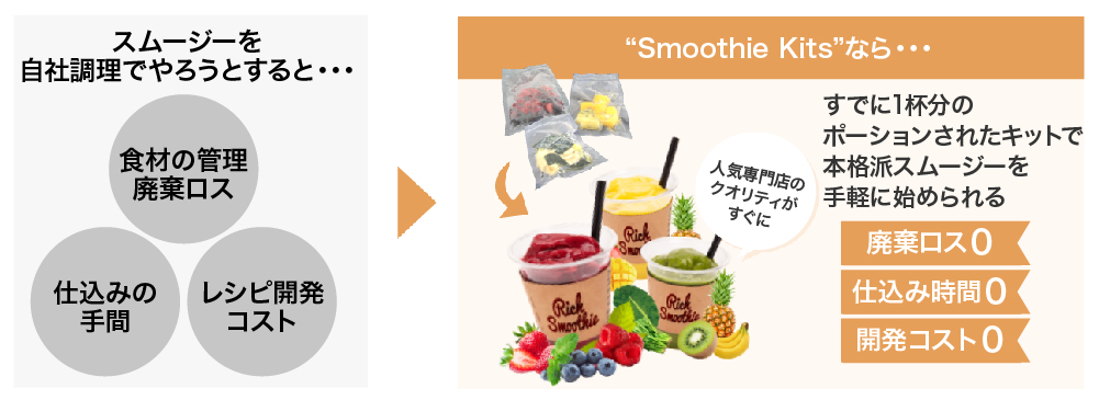 「小投資・省スペース」かつ独自開発した1杯分のポーションキットを活用することで調理や食材管理などの負担を減らし、極めて手軽に誰でもスムージービジネスをはじめることができます。