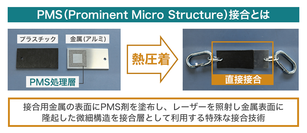 異種材料接合事業は、金属とプラスチックといった異種材料をPMS(Prominent Micro Structure)処理という特殊技術で接合する技術です。