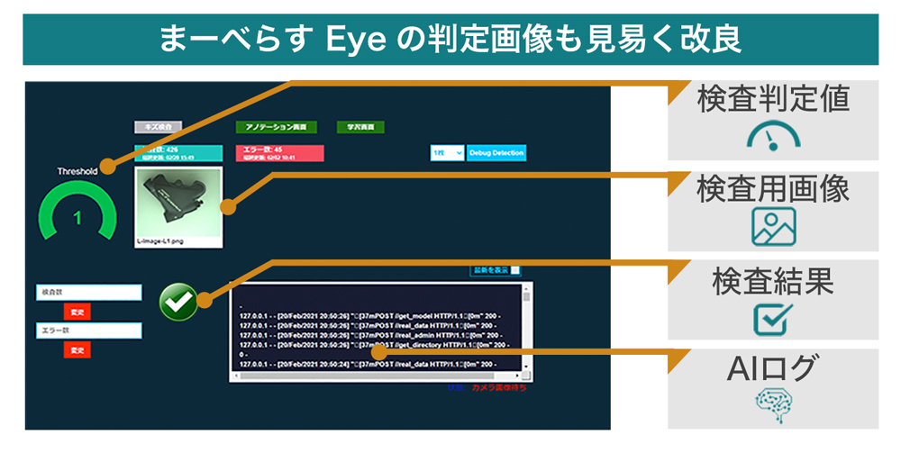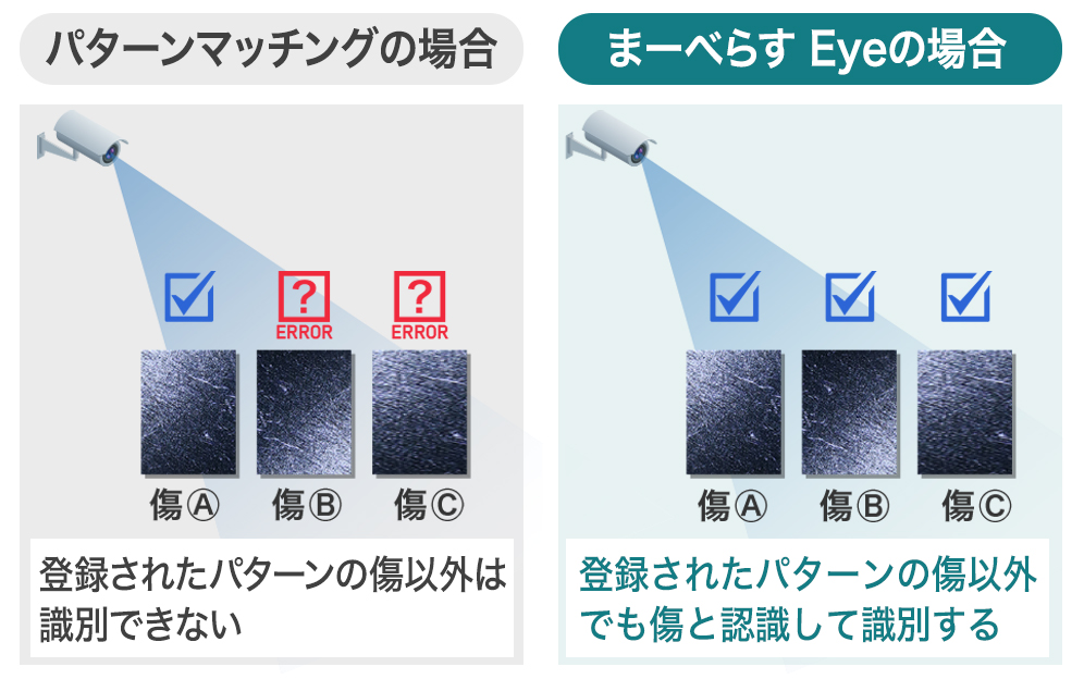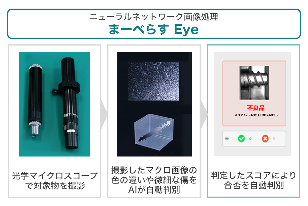 「まーべらす Eye」は、ディープラーニングで形成したニューラルネットワーク画像処理エンジンを骨格とした画像処理技術で、品質のラベリングから識別を全て自動で行ないます。