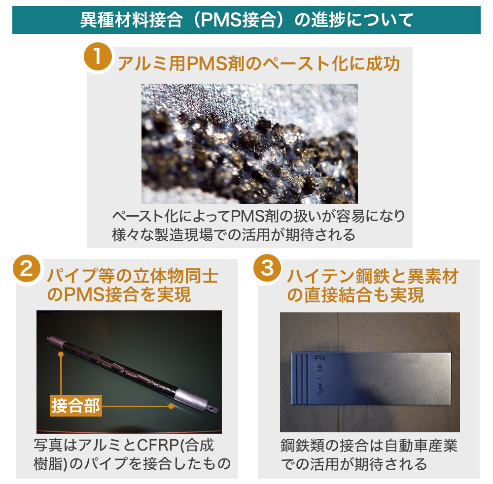 PMS剤を活用した異種材料接合事業ですが、2020年代中期から後期頃の本格導入に向け、実用化に向けたブラッシュアップが進んでいます。