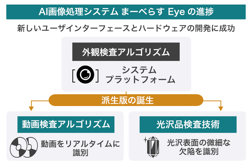 また、画像処理事業では「まーべらす Eye」の開発を行なっています。同事業は、ニューラルネットワークを骨格としたAI画像処理技術を駆使したものです。製造現場における目視での品質検査業務や、パターンマッチング画像認識では補えない不良品検知精度の向上を実現しています。