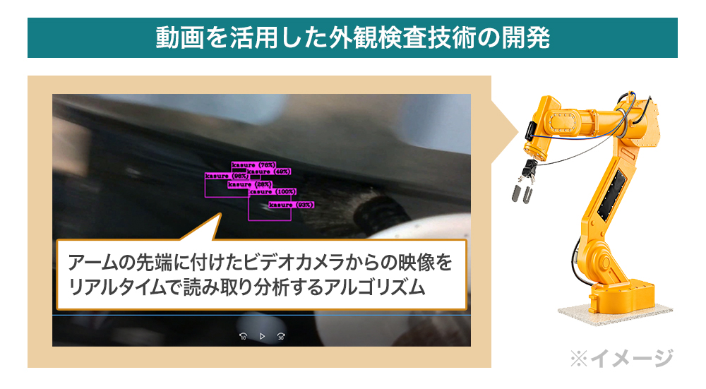 実際には、ロボットハンドの先にビデオカメラを取り付け、制作物の様子を撮影し、状態を検査するのに使います。接着剤塗布や塗装工程など、検査が非常に困難な工程への導入が期待できます。