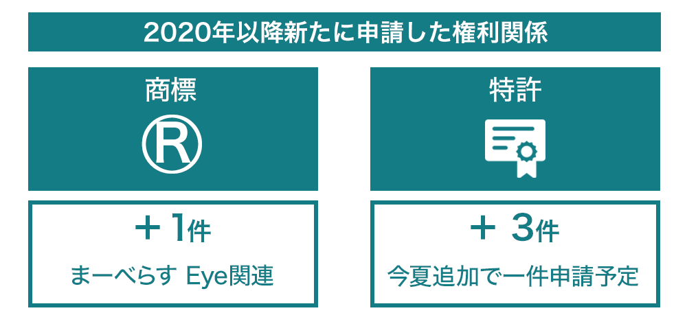 2020年以降、「まーべらすEye」に関する商標の登録を新たに1件、また、特許も新たに3件(他社と共同で出願したものも含む)出願しております。確固たる技術とその権利もしっかりと保守しながら事業を進めていきます。