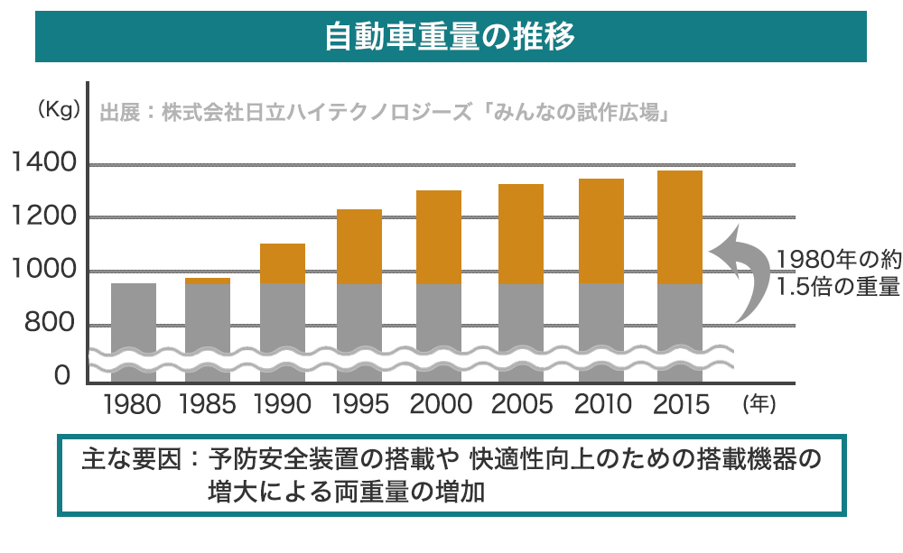 ハイブリット機能など、性能が向上するとともに、自動車の重量は近年増加している傾向にあります。