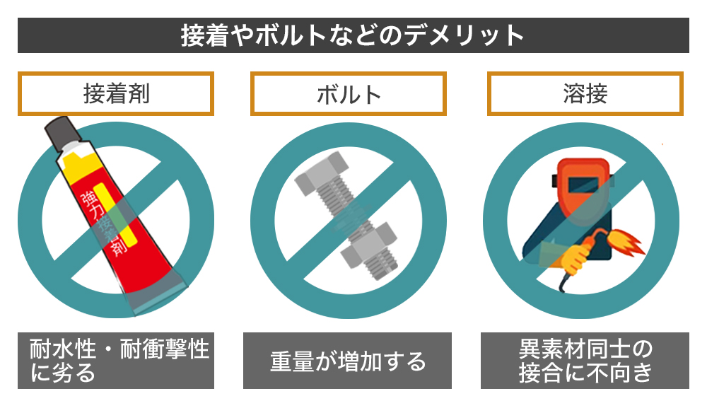 しかし、それを実現するにも、「鉄」と「合成樹脂」を接合する方法に課題があります。今までの主流である接着剤やボルト締結ではコストや強度、重さ、腐食等の課題があり中々実用化されません。