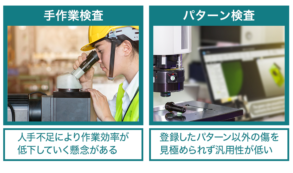 工業用部品製造の品質検査業務は、熟練者による目視やパターンマッチング式画像認識(事前に幾つかの規格パターンを機械に登録してから判別させる方式)が主流です。
