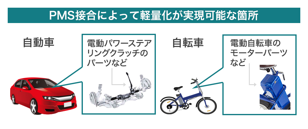 低コストで様々な用途に使える「PMS接合」は、次世代自動車のパーツ軽量化に向け試験導入をされており、2020年代中期から後期頃の本格導入を目指します。PMS剤は、1Kgで5万~10万個の部品が製造可能です。部品単価が1~2円で収まることもあり、大企業から中小企業まで幅広い受注も見込めます。