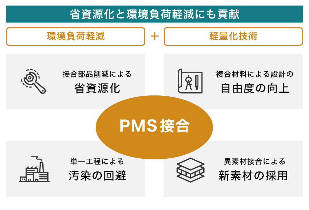 上記の「部品の複合化」における課題を解決するため、弊社が独自開発した「PMS接合」(異種材料接合技術)技術を活用すれば、金属と合成樹脂等を直接接合し、車体の軽量化はもちろん、強度の維持や耐食性、低コスト化も実現することが期待できます。
