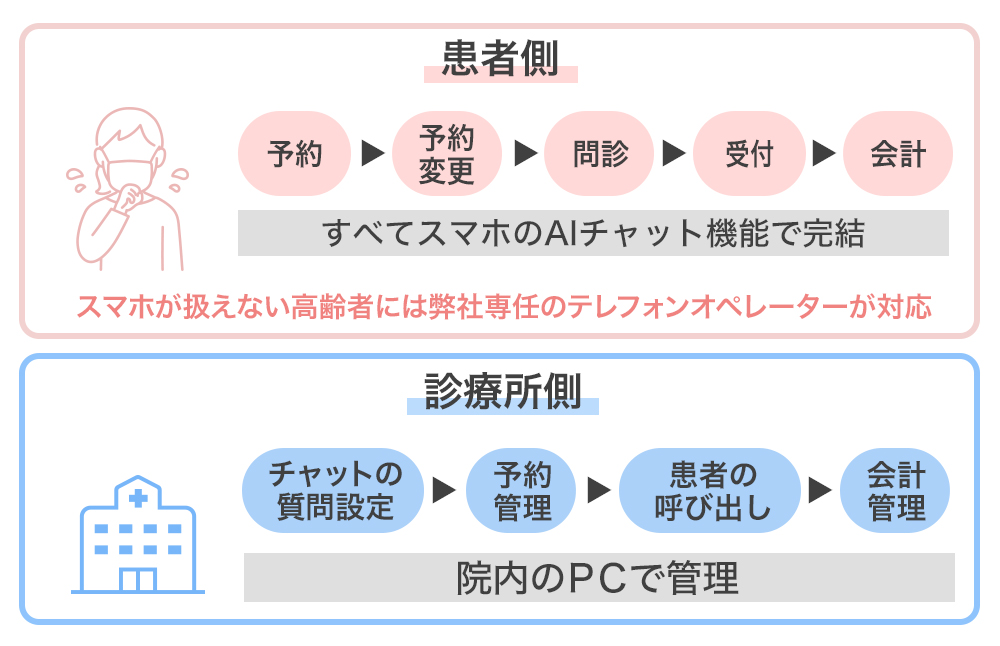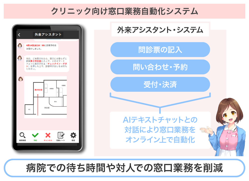当サービスは、診療所で治療を受ける際、診療所への問い合わせや予約、問診票の記入、そして当日の受付や決済までをスマートフォン上のAIテキストチャットとの対話に置き換えます。