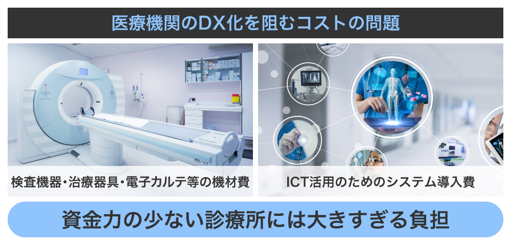 1つ目は、コストの問題です。医療機関は、CTなど各種検査機器や治療器具、電子カルテなど、一つ一つに大きな費用が発生する機材を導入しています。