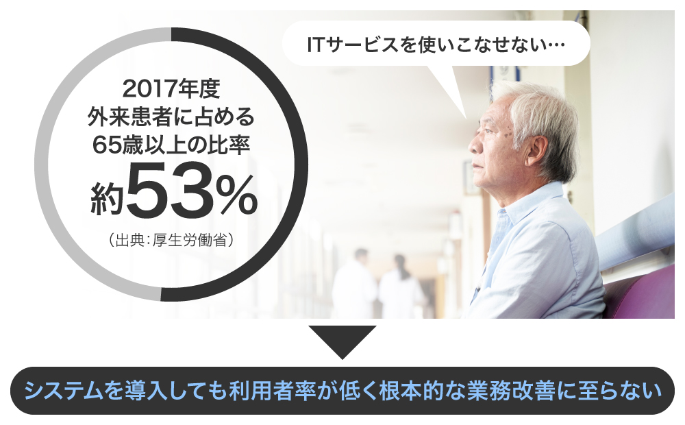 現在の日本の外来患者に占める65歳以上の比率は、約53%であり(出典:厚生労働省)、高齢者がITサービスを使えないため、システムを導入しても通院患者の利用者率が低すぎて診療所は業務改善に至らいないというジレンマがあります。