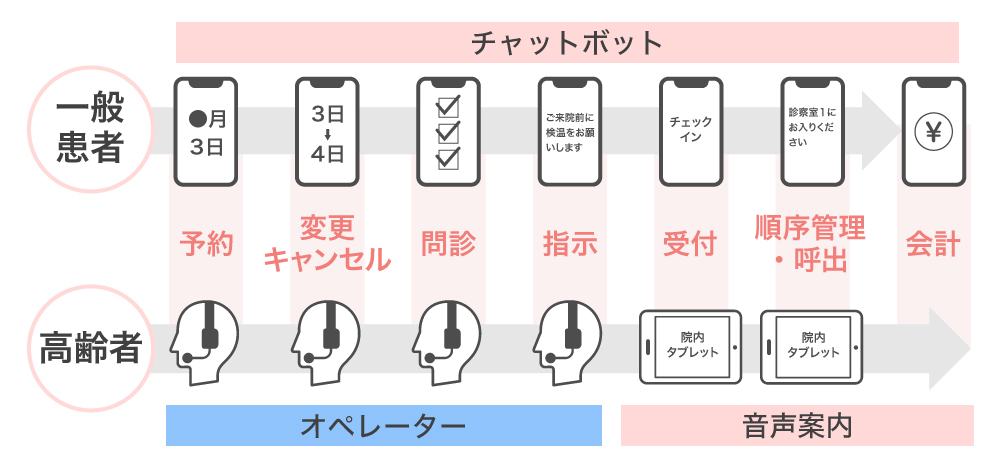 ウェブやアプリ上で、受診予約および問診を行なうオンライサービスは既に他社から展開されていますが、高齢者にはそのシステムを使えないという課題があります。