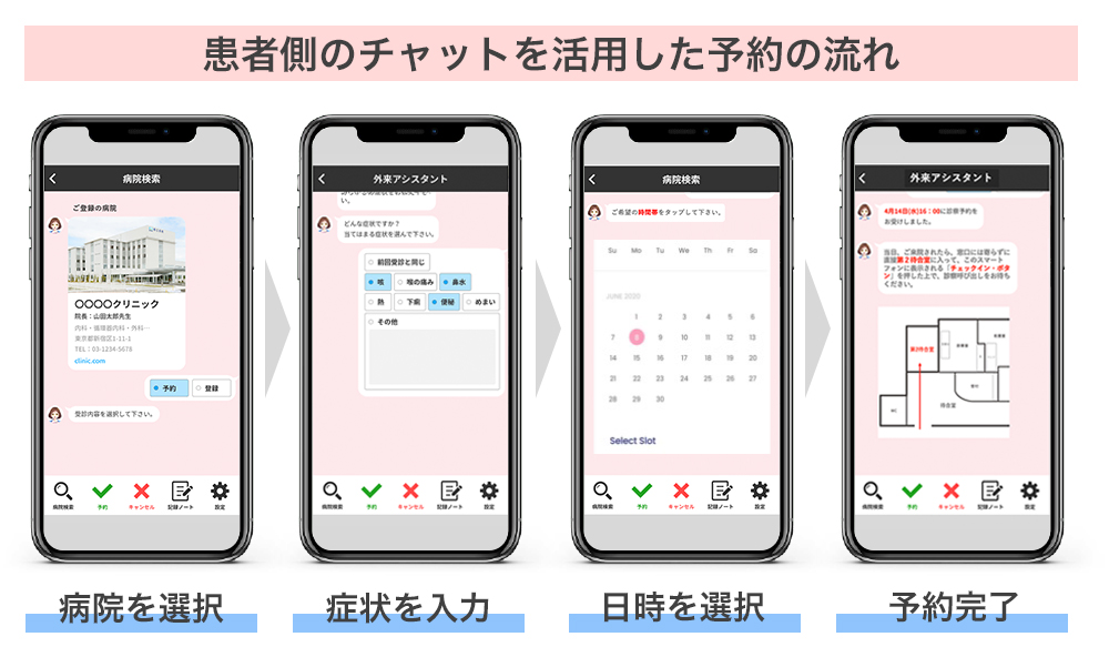 チャットボットが、患者の診療科目や初診、再診なのかといった情報を聞き取り、患者ごとの診療に必要な時間やスケジュールを自動的に把握して予約を受け付ける仕組みになっています。