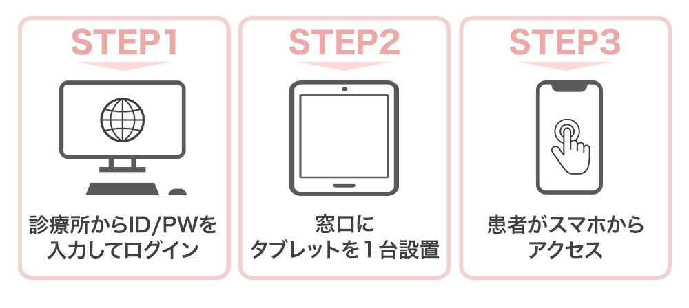 このシステムは、診療所に大きなシステム改修を要することなく、元々行っていた受付管理方法(手書き順番待ち表や予約表、予約ソフト)」から、弊社のシステムに置き換えるだけで使えるツールです。