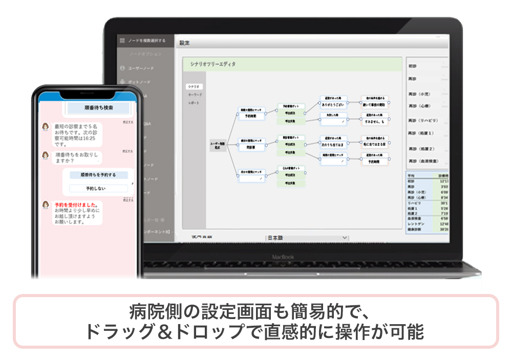 また、どの診療所の業務フローにも対応するよう、チャットシナリオは診療所側で簡単にカスタマイズできるようになっており、システムの汎用性を高めていることも強みの一つになります。