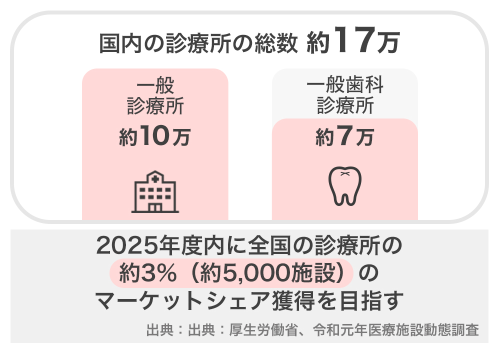 弊社は、これらの診療所に「外来アシスタント・システム」の導入を推奨し、2025年度内にこの市場の約3%(約5,000施設)のマーケットシェア獲得を目指します。