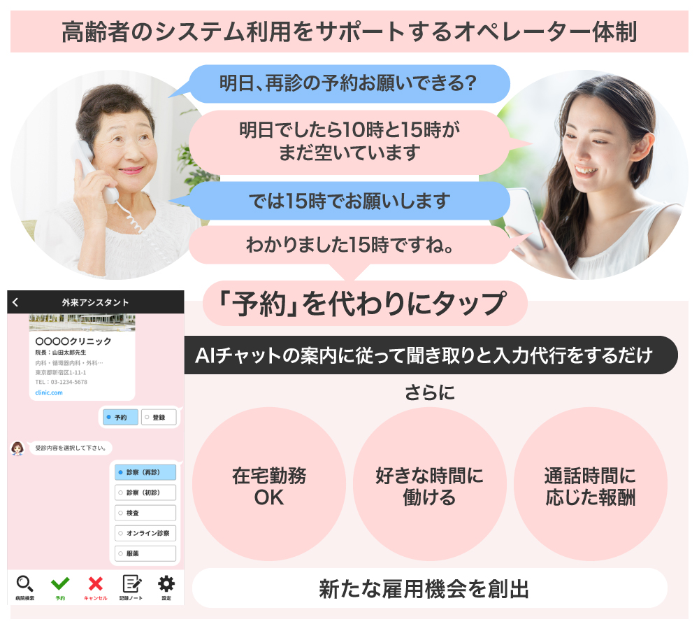 弊社は、この課題とニーズに着目し、「外来アシスタント・システム」専用の予約ダイヤルを設け、在宅オペレーターが電話対応によりAIチャットのシナリオに従った聞取りと入力代行を行う仕組みを導入します。これにより、初診・再診の予約、そして問診票の作成までをオペレーターが電話越しに代行することで、高齢者のシステム利用を実現します。