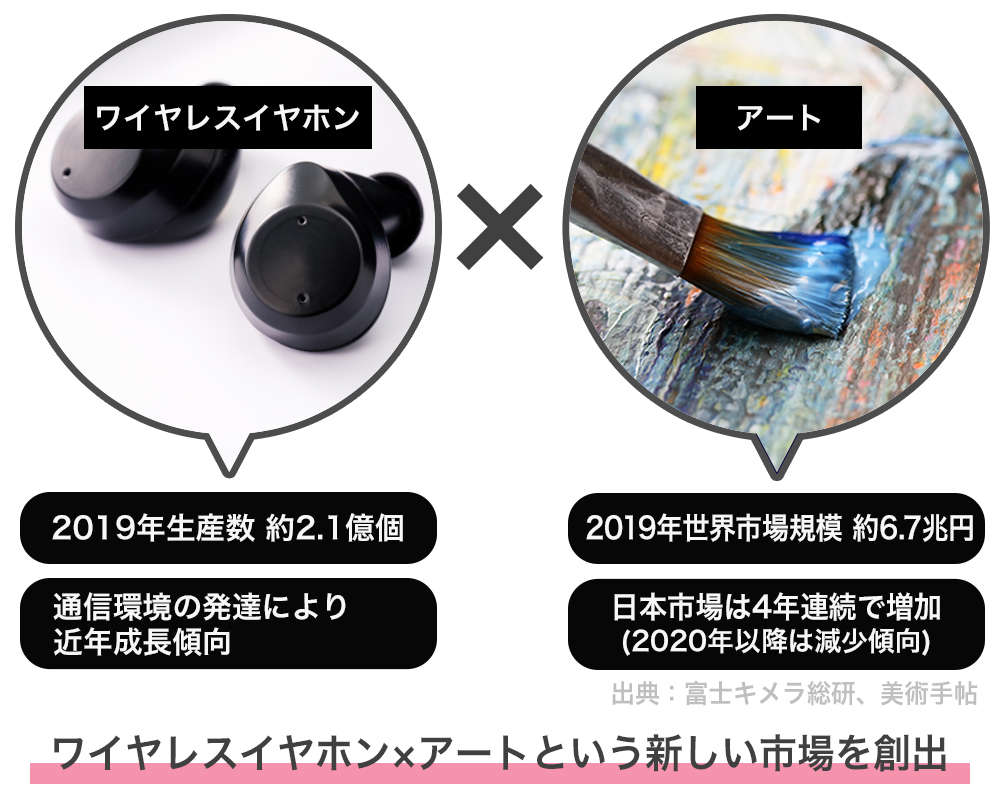 美術館などの限られた空間に収まるだけではなく、芸術を身に着けることで、芸術への造詣が深まり、表現に対する正当な利益が生まれるために活動をしています。まずはその目標とする世界を、アーティストとしても活動している私たちが「イヤホン 」を介して実現するため、「イヤホン×アート」という新しい市場を創出しました。