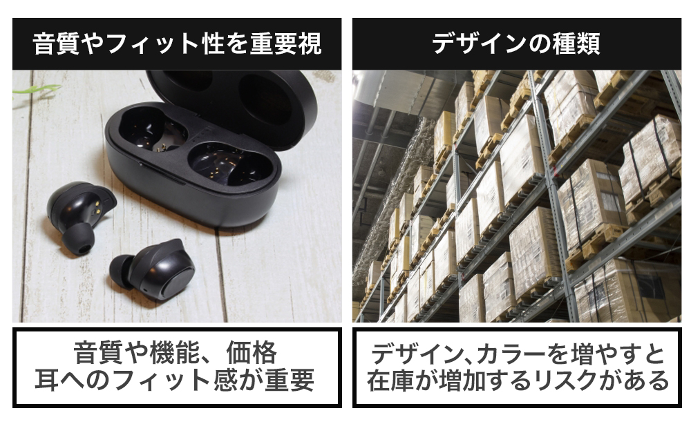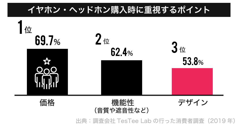 調査会社のTesTee Labの行った消費者調査によると、イヤホン選びで最も重要視するのは、1位が「価格」2位が「音質・機能」で3位「デザイン」と、消費者的にもデザインよりも機能が優先される結果となっています。