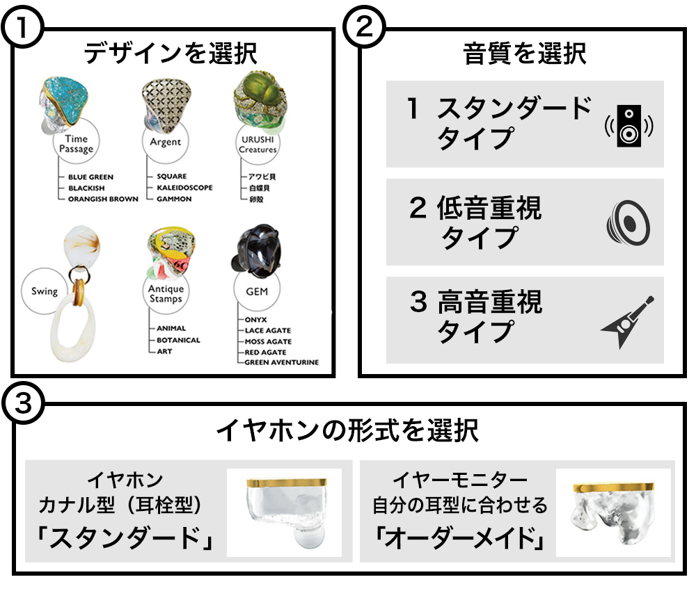 また、音質はバランスの取れた「スタンダード」、深みのある「低音重視」、プロ仕様の「高音重視」の3種類から選択ができます。 さらに、イヤホンの形状も選べ、カナル型(耳栓型)もしくは自分の耳の型に合わせた完全オーダーメイド型から選択ができます。