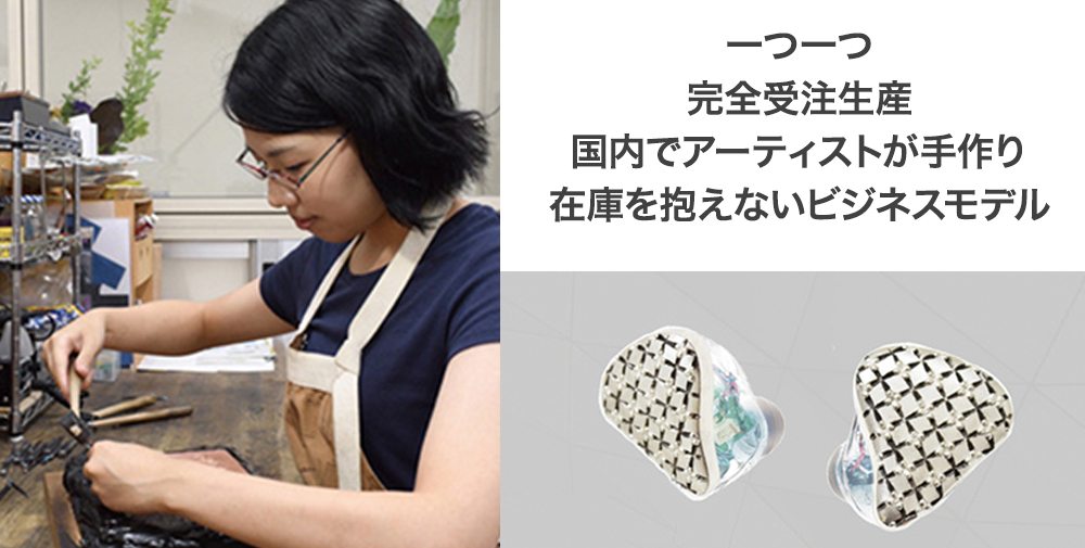 弊社の特徴は、提携しているアーティストや職人及び工場との連携により、カスタマイズイヤホンを1個からでも制作可能にしているところです。 1個からオリジナルイヤホンを作れることを強みに、個性溢れるデザインイヤホンを多数作成していきます。限定生産することで、アート作品のように一つ一つの価値を高めるブランディングを行います。