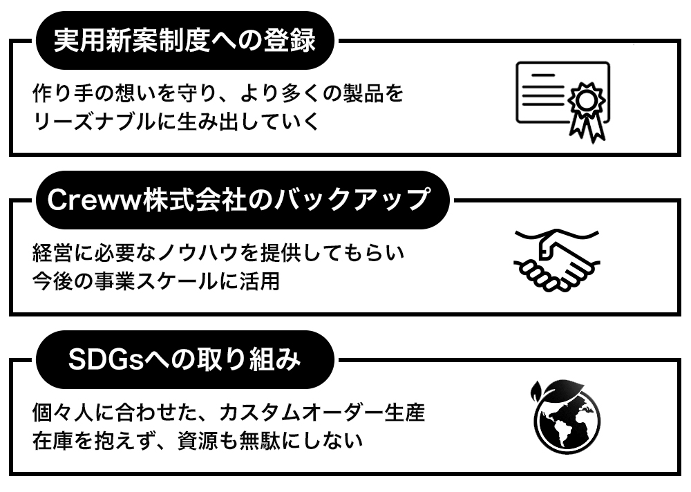 Creww株式会社は、市場検証やプロダクト開発、事業譲渡のプロフェッショナルであり、マネタイズの広げ方や資金調達の行い方など今後のビジネス展開におけるサポートを受けています。 同社から教えていただいたノウハウを自社でしっかりと取り込み、経営に活かしていきたいと考えています。
