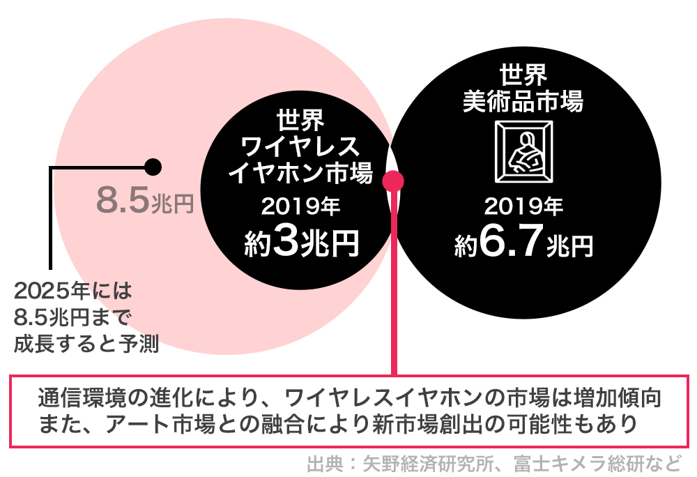 世界のワイヤレスイヤホンの市場規模は、2019年時点ですでに約3兆円ありましたが、2025年にはその約2.8倍となる8.5兆円まで成長するという予測が出されています(出典:富士キメラ総研)。