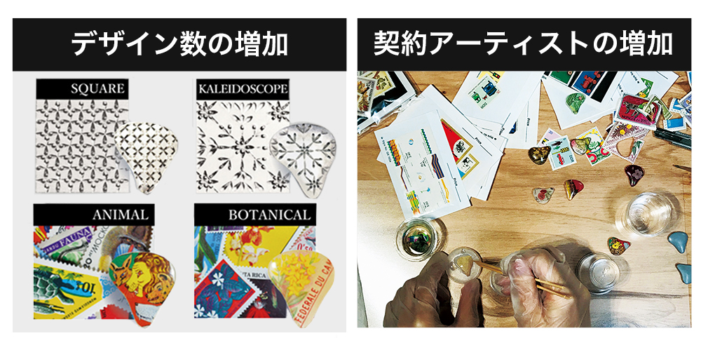 デザインの拡大(150種類)を目指します。各国のアーティストとの連携をとり、商品数拡大とその仕組み化を目指します。