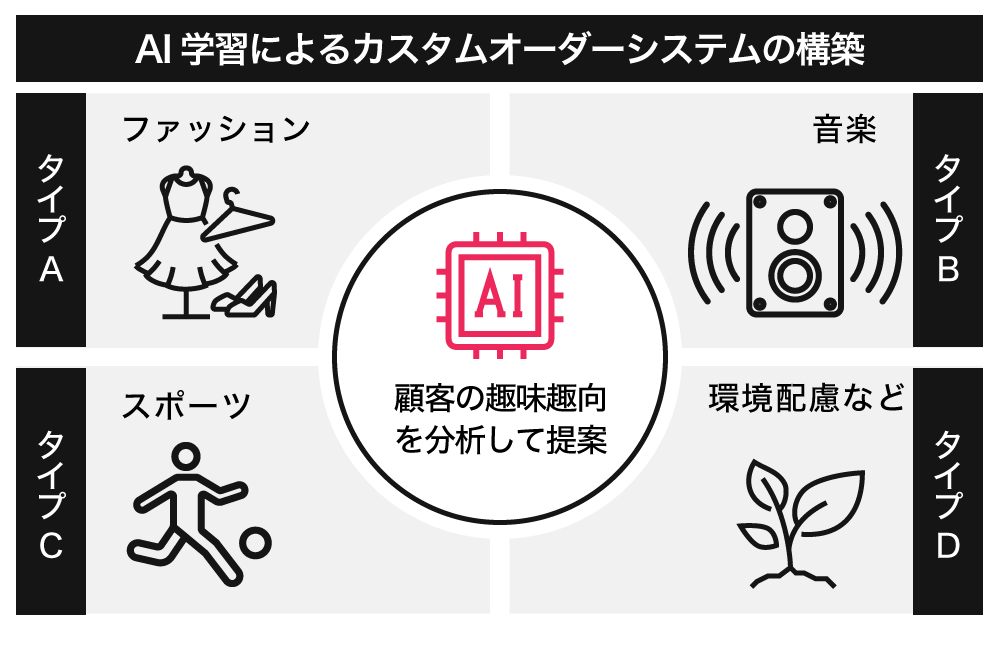近い将来開発予定の自社のECサイト上では、AI学習によるカスタムオーダーシステムの構築を目指しています。顧客の購買データ、自社内部でのデータ学習をもとに顧客一人一人の音楽・音質やデザインの趣味趣向に合わせてイヤホンの提供を行えるのをはじめとして、有名音楽アプリやファッションサイトなどと連携を取り、音楽の視聴体験がユーザーの想像を超えて豊かになる仕組みを構築していきます。