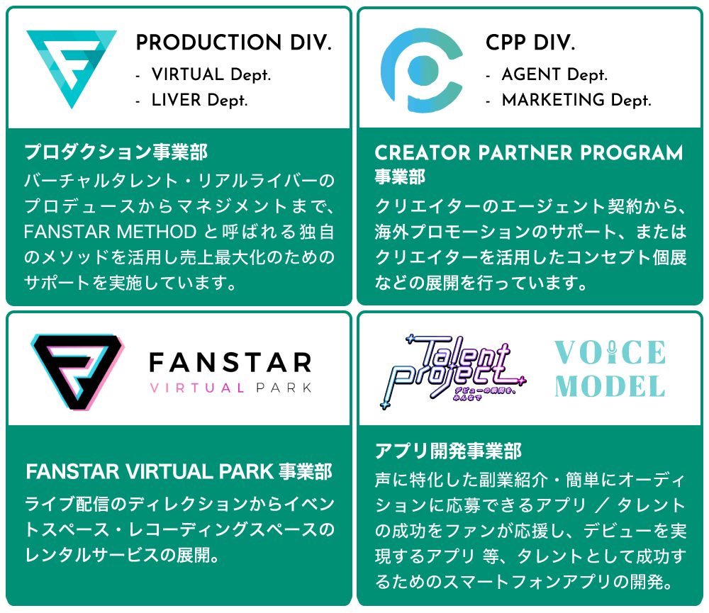 また、弊社は「Liver」の育成・支援や、バーチャルキャラクターの作成も行ってきており、6年間で延べ1,000人以上のタレントを独自の育成プログラム「FANSTAR METHOD(メソッド)」により輩出してきました。この仕組みを、イラストレーターや声優と組み合わせることにより、「バーチャルタレント」の発掘や育成〜運用に応用展開しています。