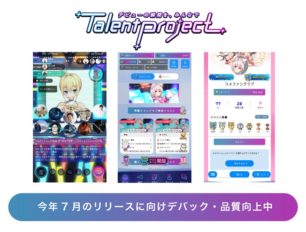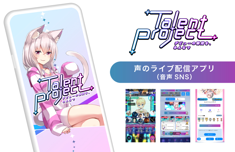 元々はファンの応援アプリとしてリリース予定だった「タレントプロジェクト」アプリを、声のライブ配信アプリ(音声SNS)に変更し「TalentProject」として、今年7月のリリースに向けて、デバック・品質向上中です。