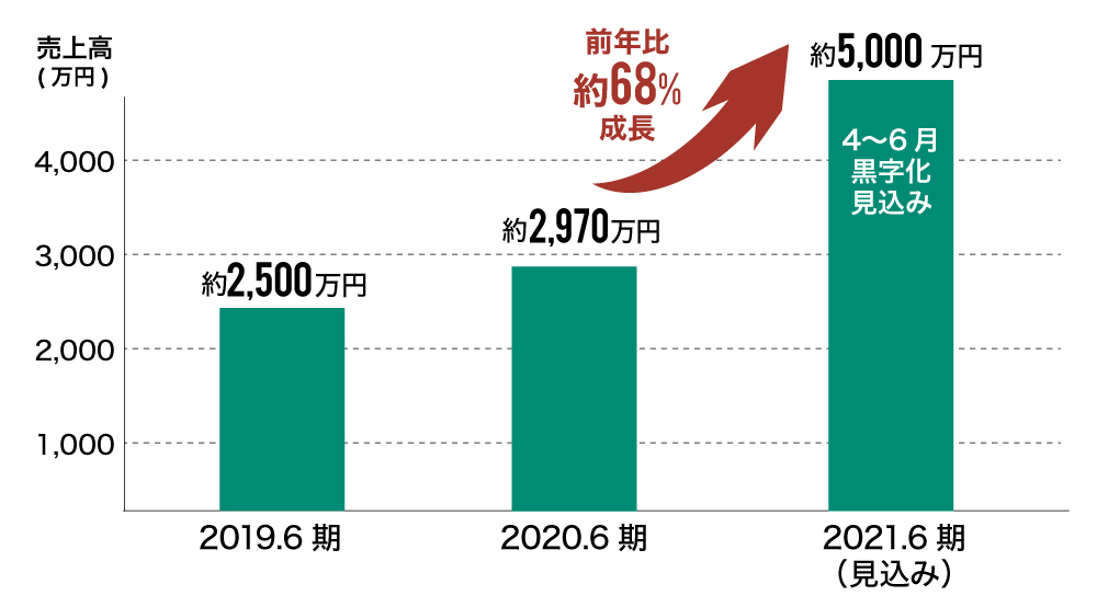 当事業部の成長もあり、弊社全体の売上としては2021年6月期においては5,000万を超える予定です。これは、前期売上約2,970万円と比べると約68%の売上高成長率になります。