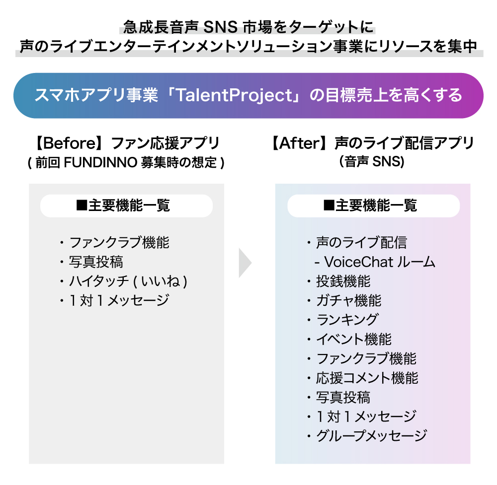 投資家の皆様のお力を貸して頂くことにより、音声SNSアプリ「TalentProject」をリリース及びグロースし、夢をもったタレント・アーティストが、日本そして世界で活躍することを目指します。
