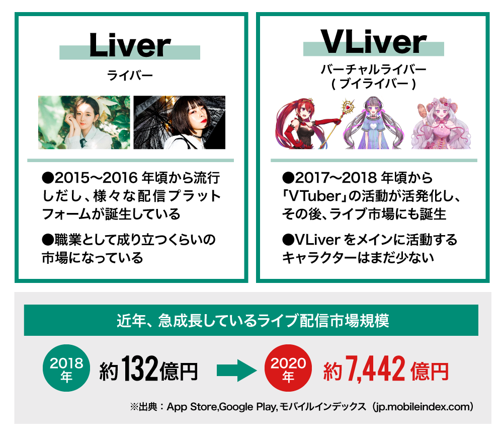 その様な中、以前からも人が出演するリアルライバーによるライブ配信は行われており、日本では2016年頃に流行し、市場規模も急成長しています。