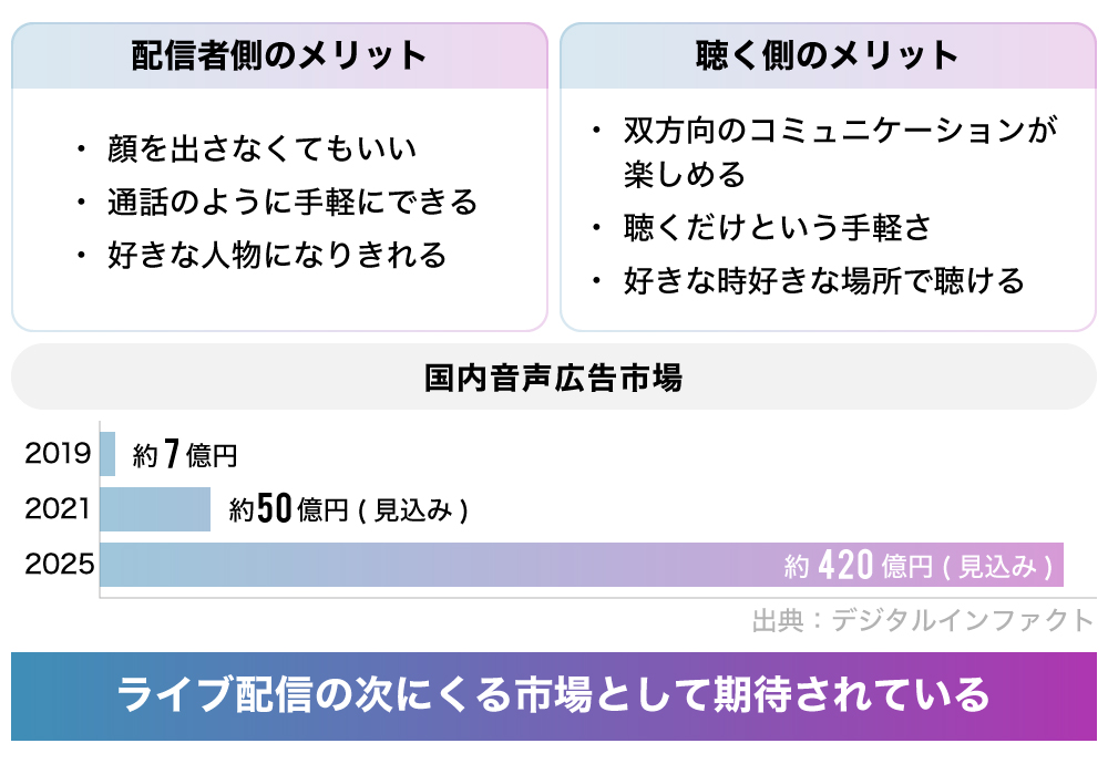 これは、近年『Clubhouse』をはじめ、『Twitter』などにも機能が実装され急速に拡大している「音声SNS」市場に対し、バーチャルタレントやリアルライバーとの活用がいいからです。