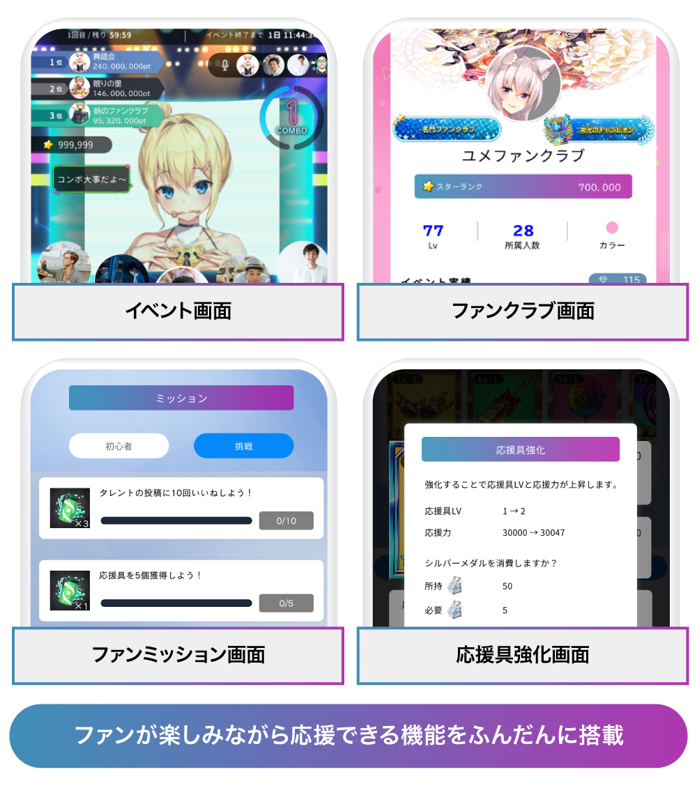 スマートフォンアプリ「VOICE MODEL」と「TalentProject」の開発・運営を行います。「TalentProject」内では有料のポイント購入ができる他、応援するファン向けの特典として、オリジナルイベントへの参加券や応援ランキングなどの仕組みも用意します。