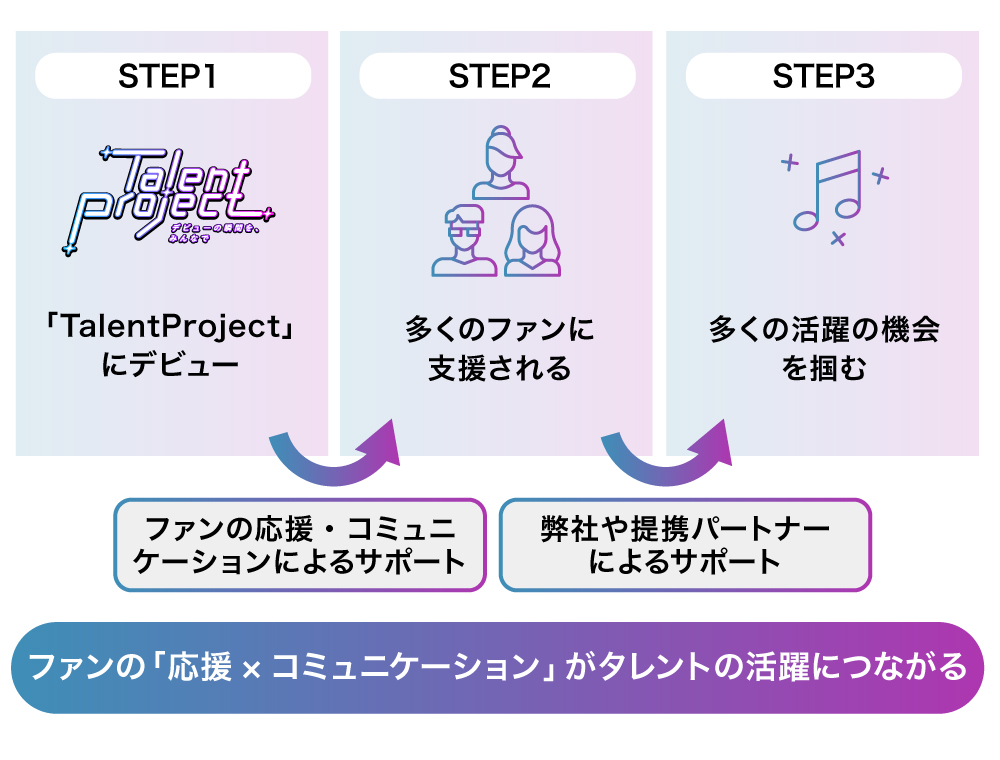 この様なパートナーとの連携も生かしながら、タレントとファンの間に入ることで、ファンの応援を夢の実現に最大限活かすことができると考えています。