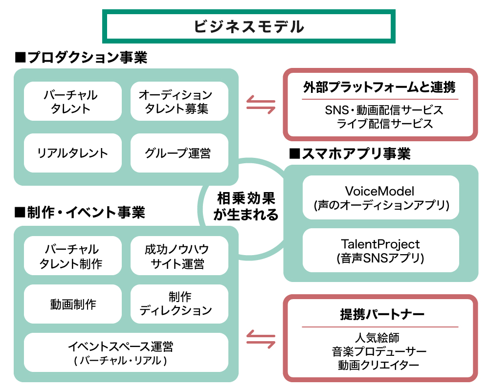 各事業間の相乗効果としては「制作事業の提携クリエイターに、プロダクション所属VLiverのアバターや楽曲の制作を依頼する」「アプリでポイントを多く集めているライバーをプロダクションにスカウトする」などが挙げられます。