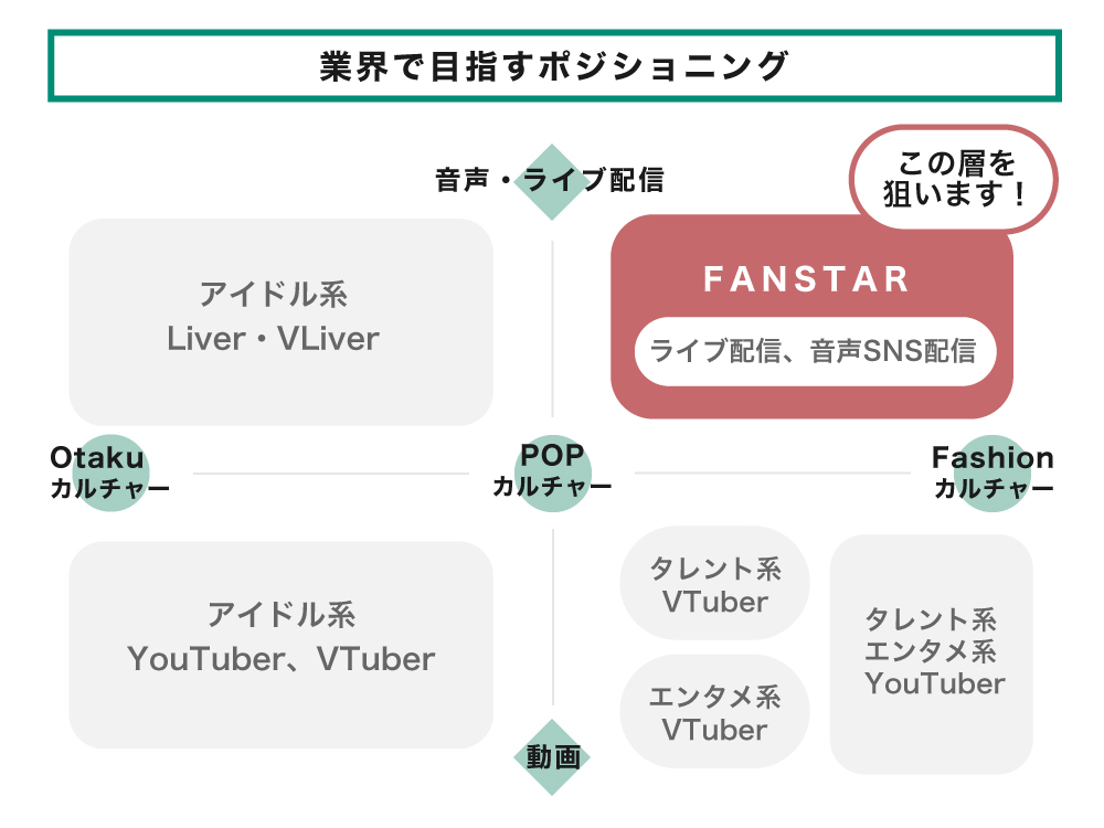弊社は、従来のバーチャルタレント事務所がカバーできていない「ライトオタク層」をターゲットとしています。