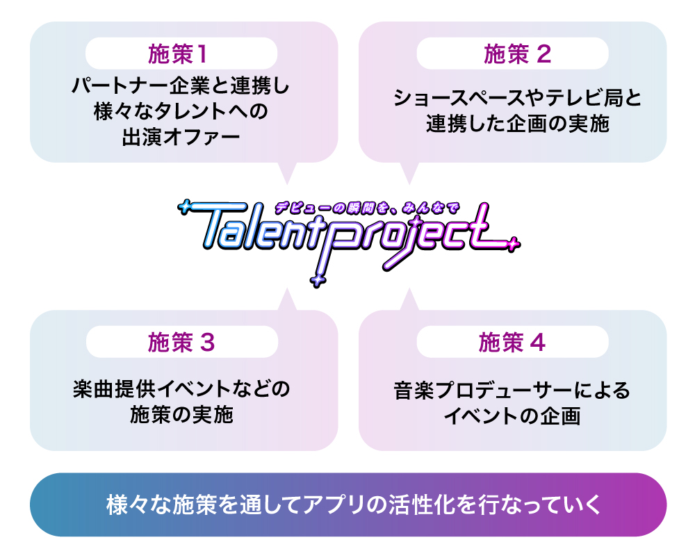 また、アプリに登録するタレントは、獲得ポイントが多くなると、弊社の提携クリエイターによる楽曲支援やメディア出演といったチャンスを掴むことができるようになります。さらに、弊社には今まで培ってきた多くの業界パートナーがおり、彼らのチカラも活用しながらタレントを最大限バックアップします。