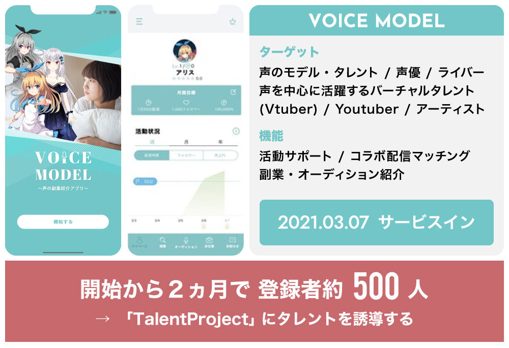 「VOICE MODEL (声のオーディションアプリ)」に加え、「TalentProject(音声SNSアプリ)」を今年7月頃にリリースすることを目指します。